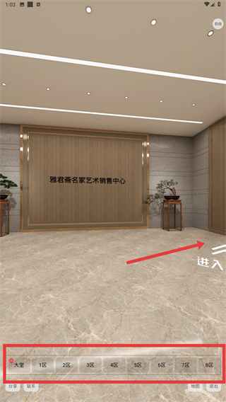 4、點(diǎn)擊【進(jìn)入-功能按鈕】,進(jìn)入藝術(shù)館場景,可選擇不同區(qū)域?yàn)g覽。