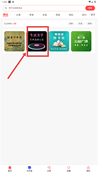 1、在首頁點(diǎn)擊【生活美學(xué)-功能入口】,進(jìn)入元宇宙數(shù)字藝術(shù)城區(qū)頁面。
