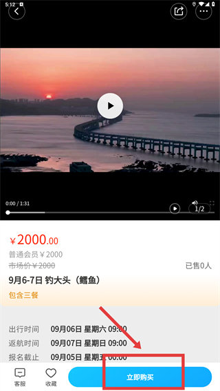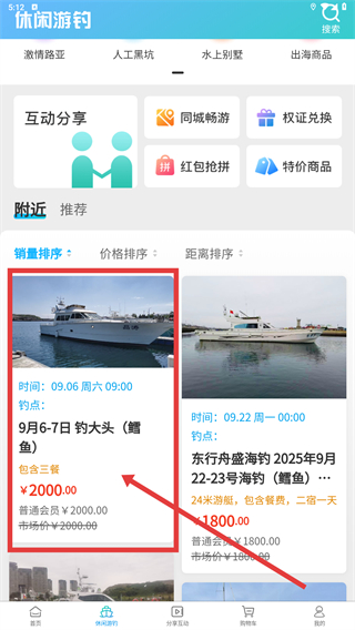 2、在列表頁面,借助銷量、價(jià)格、距離等排序方式篩選出目標(biāo)游釣項(xiàng)目,選定具體項(xiàng)目(例如“9月6 - 7日釣大頭(鱈魚)”)后進(jìn)入詳情頁面。