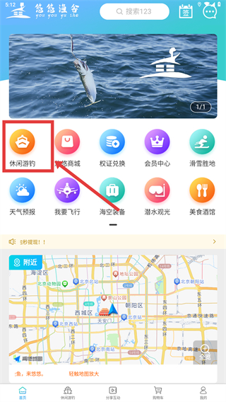 1、在首頁點(diǎn)擊【休閑游釣】功能入口,進(jìn)入游釣服務(wù)列表頁面。