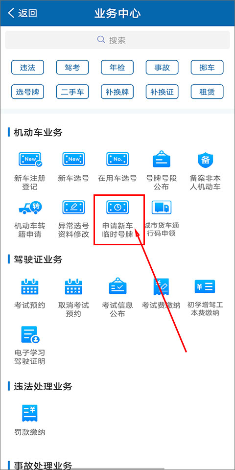 2、跳轉到“業(yè)務中心”頁面,在“機動車業(yè)務”下選擇“申請新車臨時號牌”點擊進入;