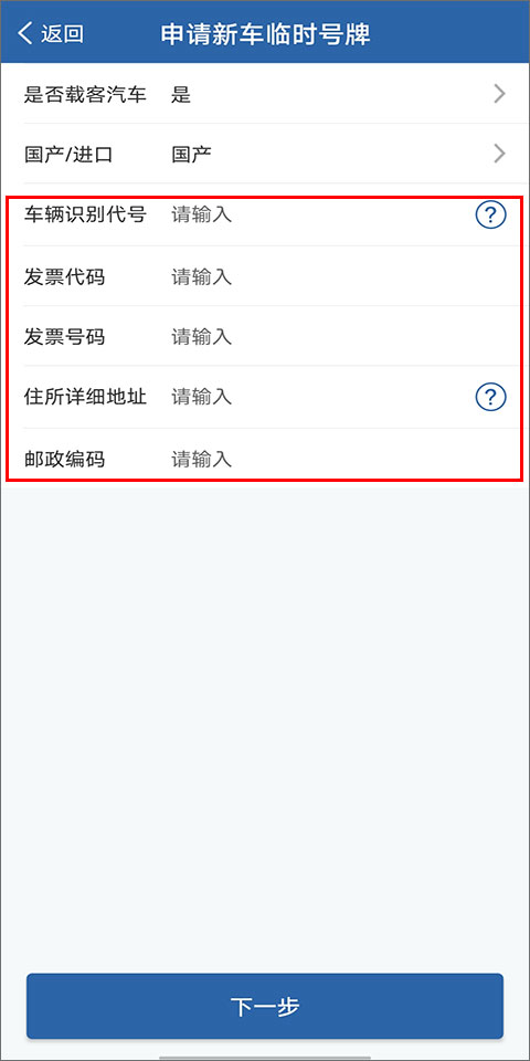 5、請?zhí)顚戃囕v識別代號、住址及郵政編碼等相關信息。若不清楚自己車輛的識別代號,可點擊其后的“?”,以了解查詢方式。填寫完畢后,點擊“下一步”,并上傳所需資料。