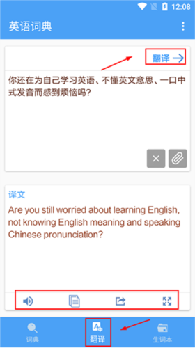 3、中譯英步驟:點(diǎn)擊【翻譯】按鈕,輸入中文內(nèi)容,系統(tǒng)便會(huì)自動(dòng)翻譯成英文。翻譯完成后,可對(duì)生成的英文句子執(zhí)行復(fù)制等操作。