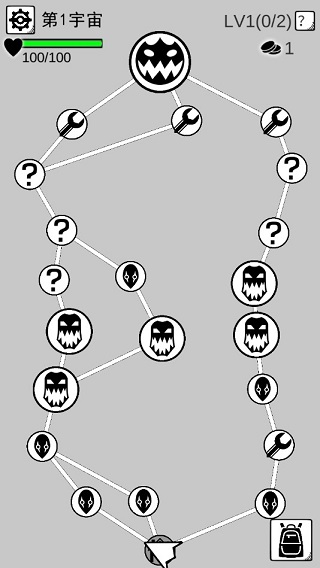 接下來展示的便是玩家即將踏上征程的宇宙地圖。該地圖采用推圖式的關(guān)卡冒險模式,存在多條發(fā)展路線。每一條路線的選擇,對玩家而言都是頗具難度的挑戰(zhàn)。此地危機四伏,敵人眾多,當(dāng)然,其中也不乏驚喜與驚嚇。