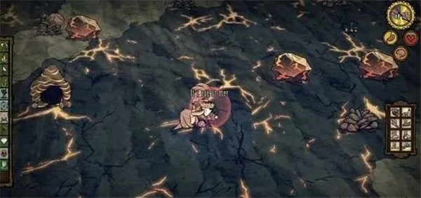 前期:武器可以用長矛過度。至于防具的話,剛開始豬很難打而且也很難找,所以遇到豬后最好搞4個怪物肉讓它強制變身,穩定獲取一個豬皮拿來做雨傘/豬皮帽。或者在10天左右等第一次月圓夜里去殺瘋豬,打2走1,循環幾次就行。