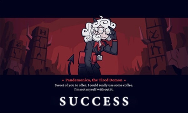 攻略:關(guān)卡VIII,攻略時與「地獄女皇」路西法對話中,第一次選擇選項2「不,謝謝。但是您可以加入我的后宮」,第二次選項選擇2「我可以提供咖啡,回合制策略及巧克力煎餅。」,即可獲得。